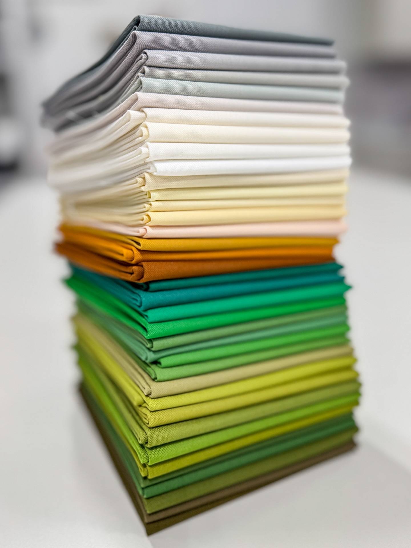 In my last letter I told you about the 18 new colors of Bella Solids by Elizabeth Hartman arriving soon. Well here they are! One of the colors is named Meridian (our hometown)!