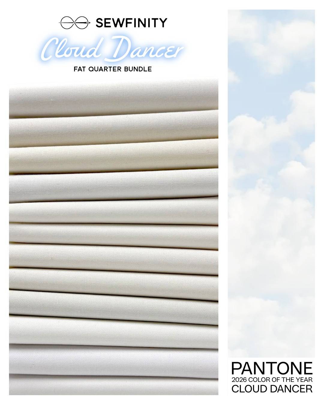 I got the Pantone swatch and saw that Cloud Dancer is a slightly warm white with a touch of glow. I matched up the closest 12 solids in our warehouse and here it is, our fabric bundle for Cloud Dancer, the 2026 Pantone Color of the Year 🌧